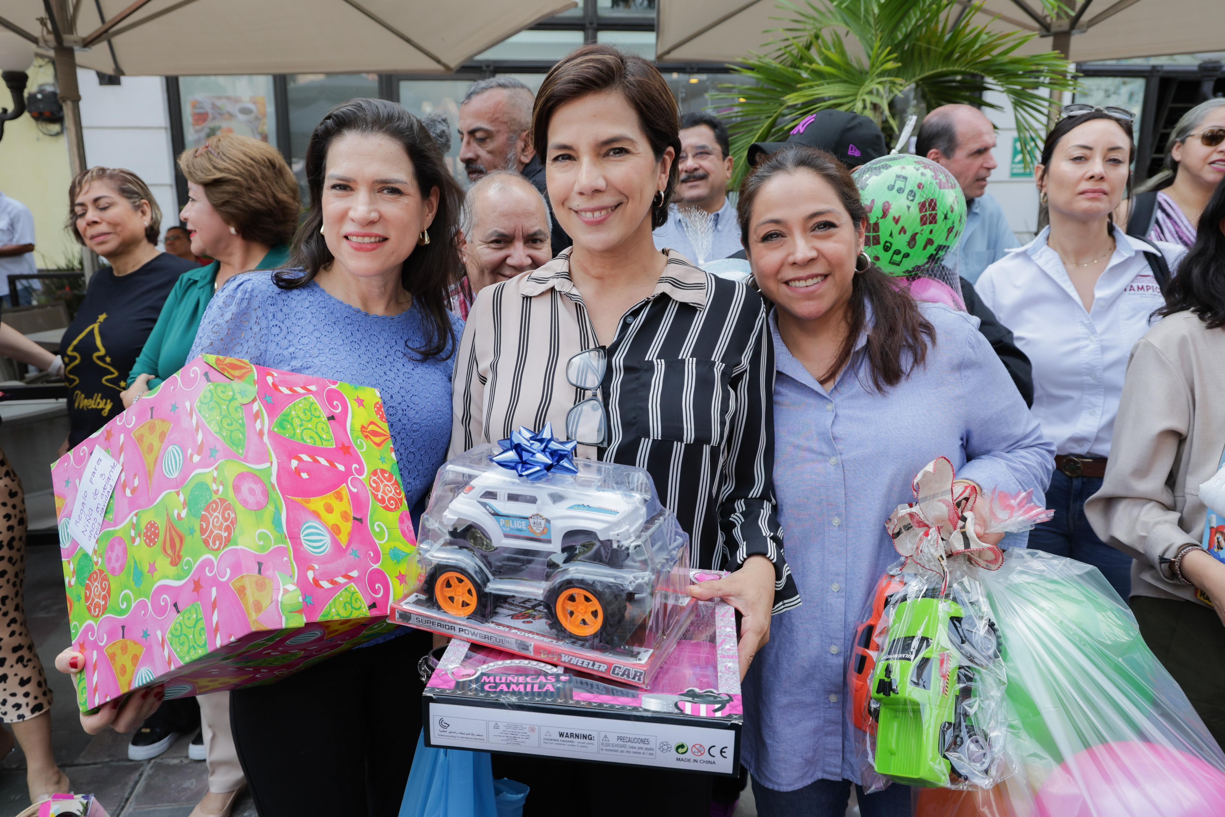 Mónica Villarreal, acompañada también por los titulares de las dependencias organizadoras, Paola Del Sol Mejía y Luis Peraza Lacorte; y miembros del Cabildo subrayó que la campaña incluye la colocación de cuatro grandes contenedores especiales en sitios estratégicos, donde la ciudadanía podrá depositar los juguetes para entregar a los niños tampiqueños durante el festival de Día de Reyes.