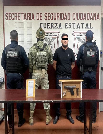 Se detuvo a una persona, se aseguraron 14 cartuchos, un arma corta, un cargador, 107 dosis de metanfetamina, dosis de marihuana, dosis de cocaína y un vehículo.