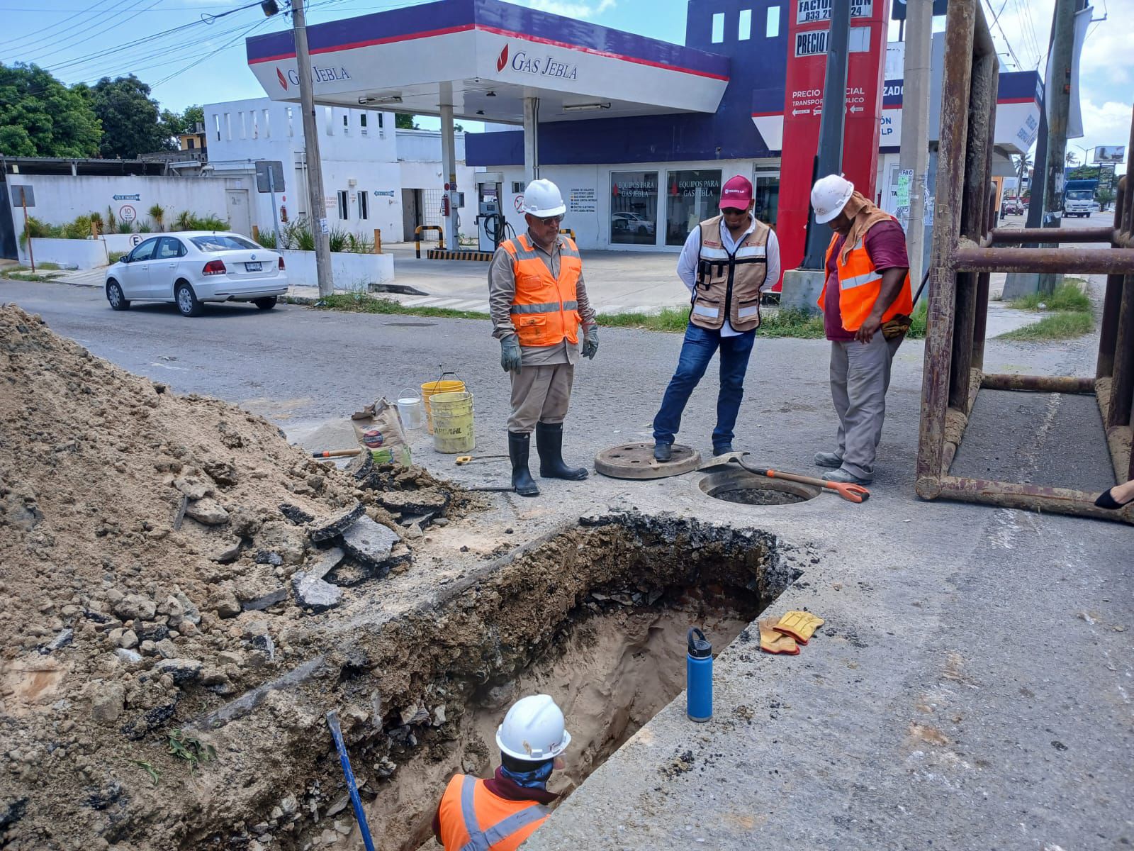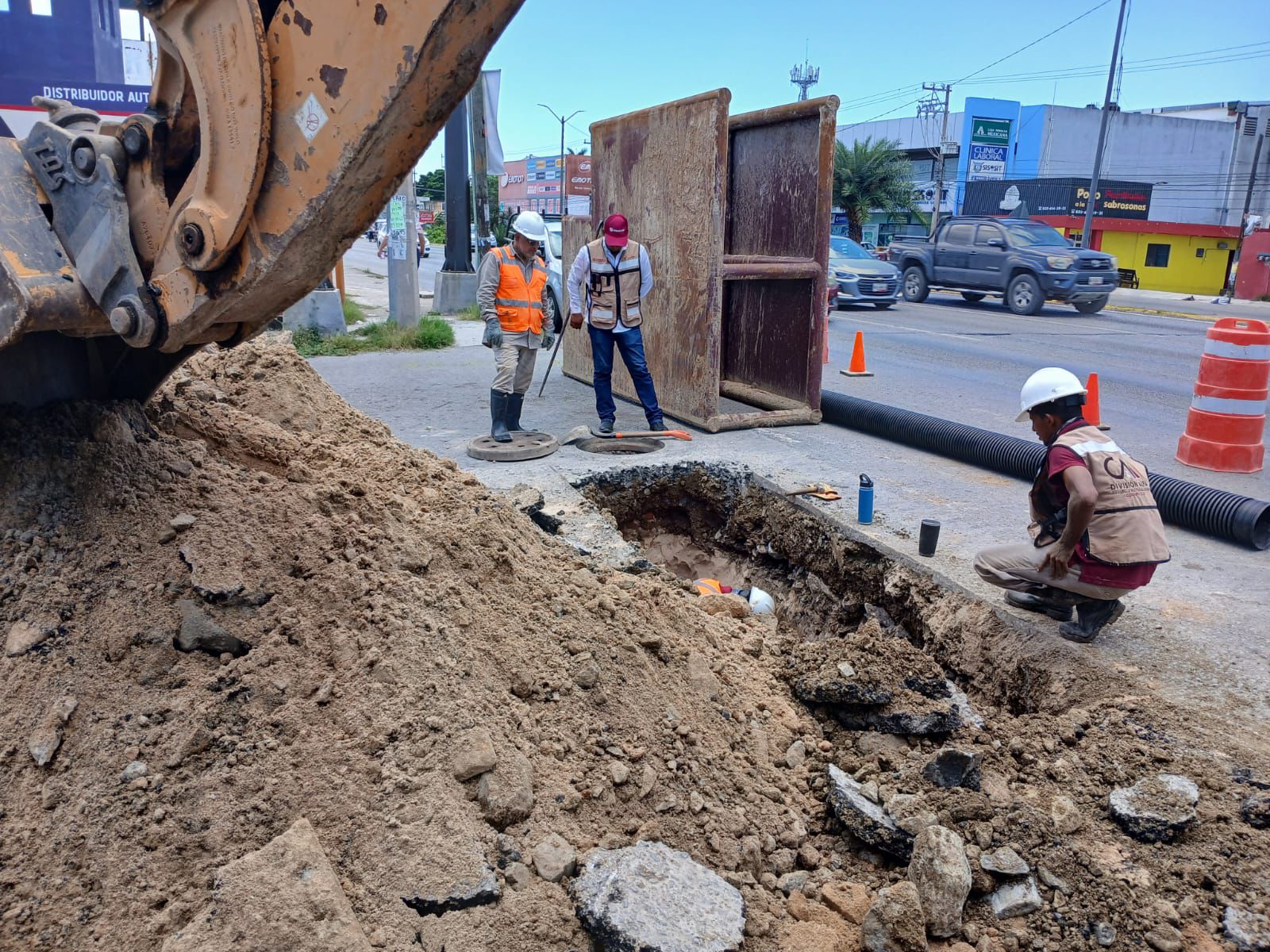 Actualmente, se realizan trabajos correctivos en la carretera Tampico-Mante, esquina con Francisco I. Madero, en la colonia Francisco Javier Mina de Tampico, donde se presentó un hundimiento como consecuencia del colapso de la red general de drenaje.