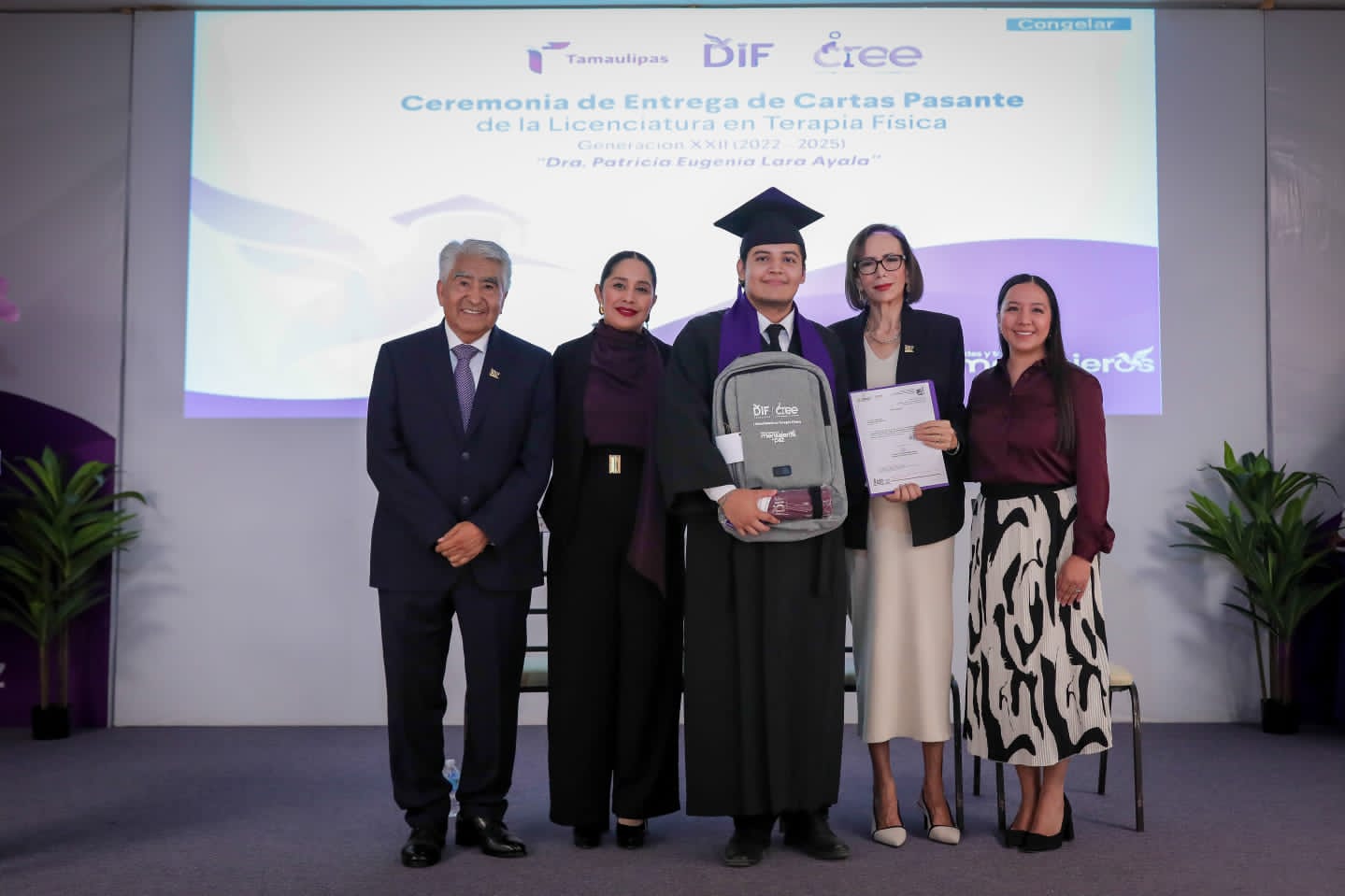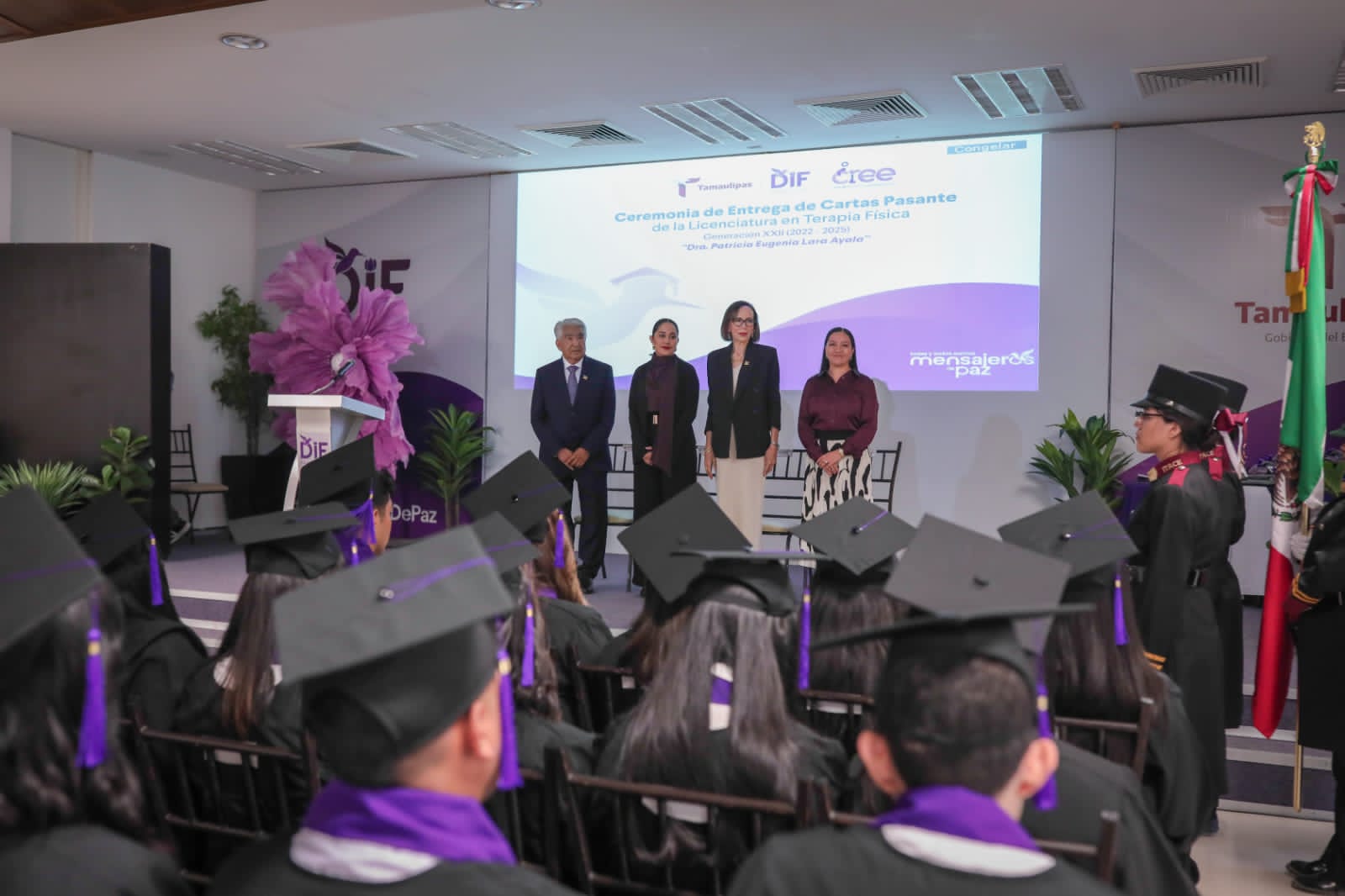 El Sistema para el Desarrollo Integral de la Familia de Tamaulipas, que preside la doctora María de Villarreal, llevó a cabo en el auditorio principal de esta institución la ceremonia de entrega de cartas de pasante a 24 nuevos profesionistas egresados de la Licenciatura en Terapia Física del Centro de Rehabilitación y Educación Especial (CREE), dependiente de este sistema.