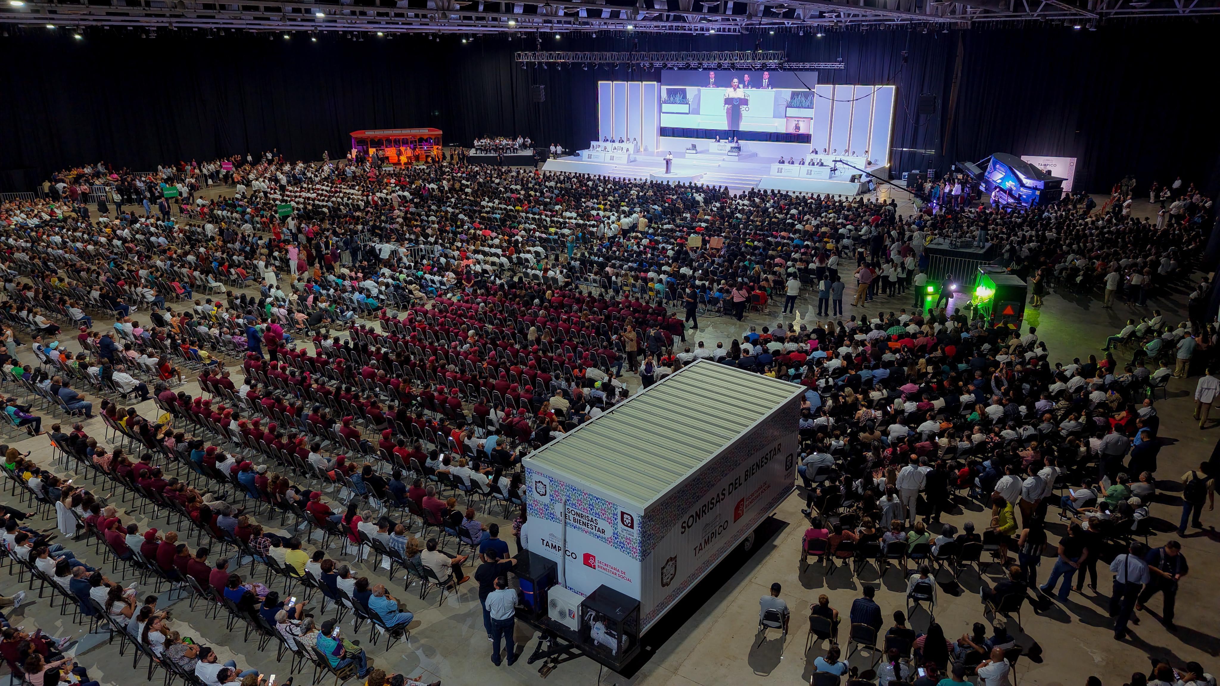 Ante más de cinco mil personas reunidas en el Centro de Convenciones y Exposiciones de Tampico y acompañada de los alcaldes de la región, así como por integrantes de la sociedad civil, empresarios y servidores públicos estatales y federales, Mónica Villarreal enumeró los logros en cada uno de los cinco ejes rectores que son el pilar de su gobierno.