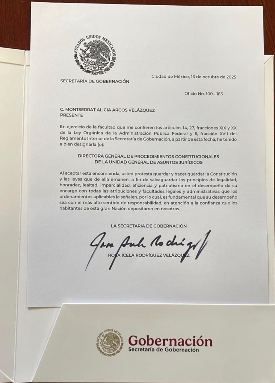 El nombramiento fue formalizado mediante el Oficio No. 100.-165, firmado por la titular de la Secretaría de Gobernación, Rosa Icela Rodríguez Velázquez, quien destacó que la encomienda se otorga con fundamento en lo dispuesto por los artículos 14 y 27 de la Ley Orgánica de la Administración Pública Federal, así como en el Reglamento Interior de la SEGOB.