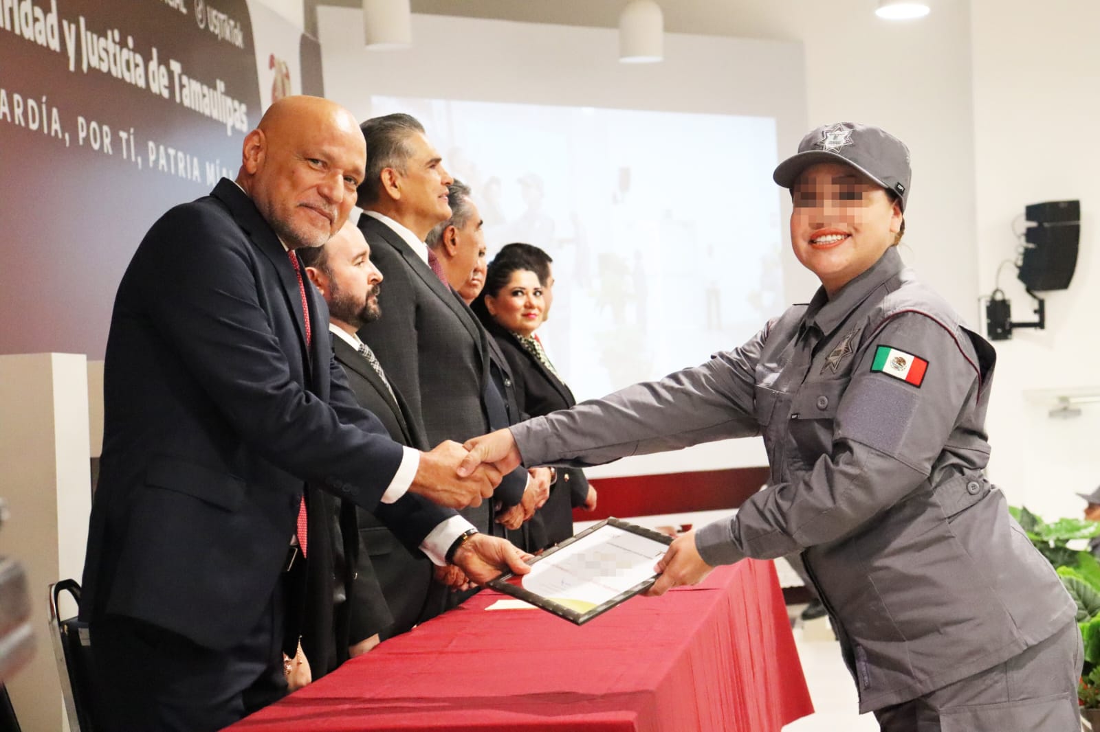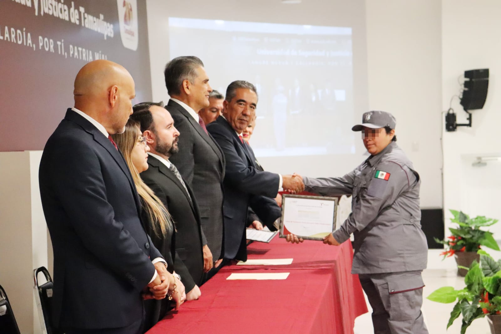La graduación celebrada en el Auditorio de la USJT contó con la presencia del secretario de Seguridad Pública de Tamaulipas, Carlos Arturo Pancardo Escudero, quien reiteró el compromiso de la dependencia a su cargo de transformar el sistema de seguridad y justicia con la firmeza de los valores, la aplicación de las mejores prácticas y el respeto a los derechos humanos, para proteger y servir a la ciudadanía.