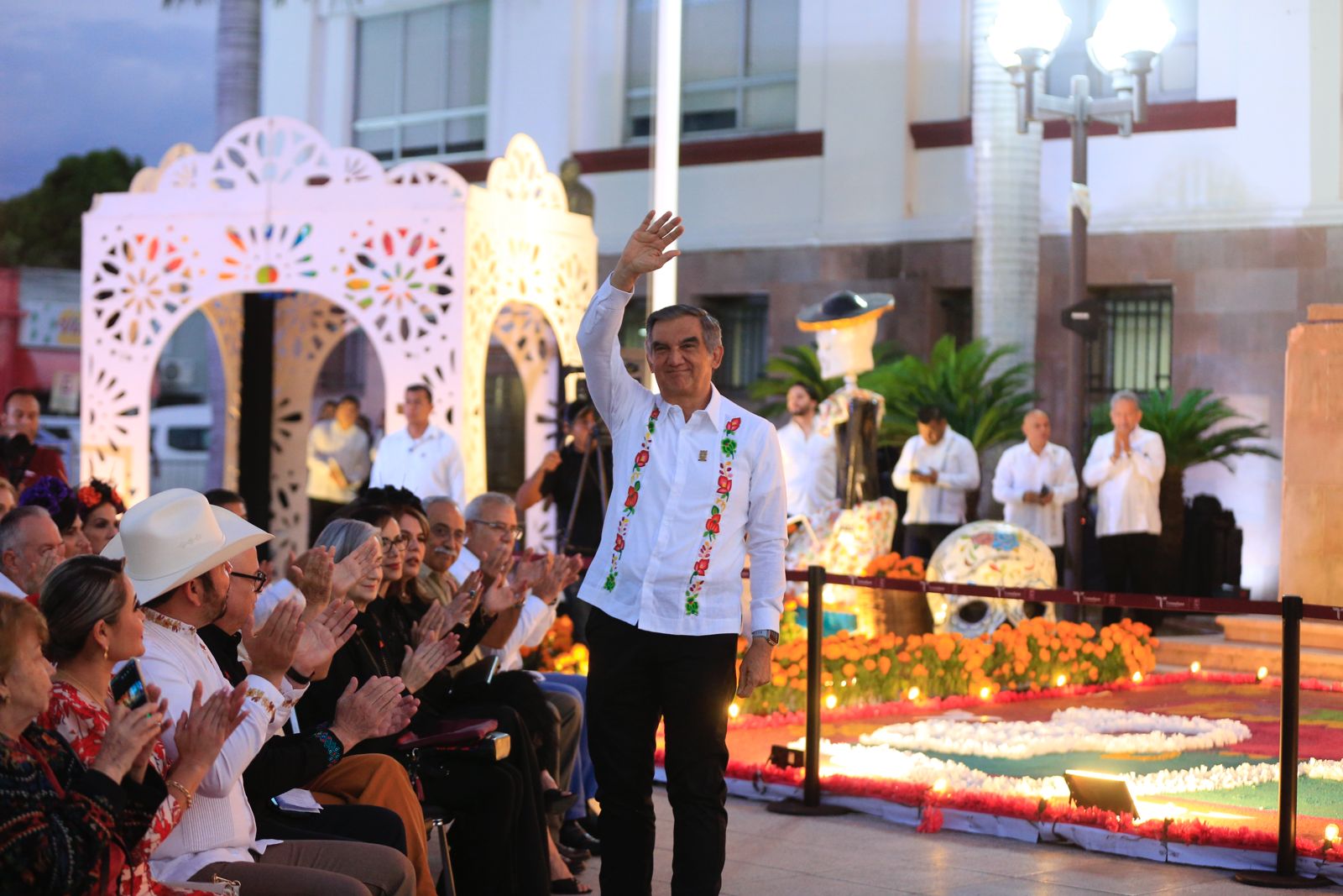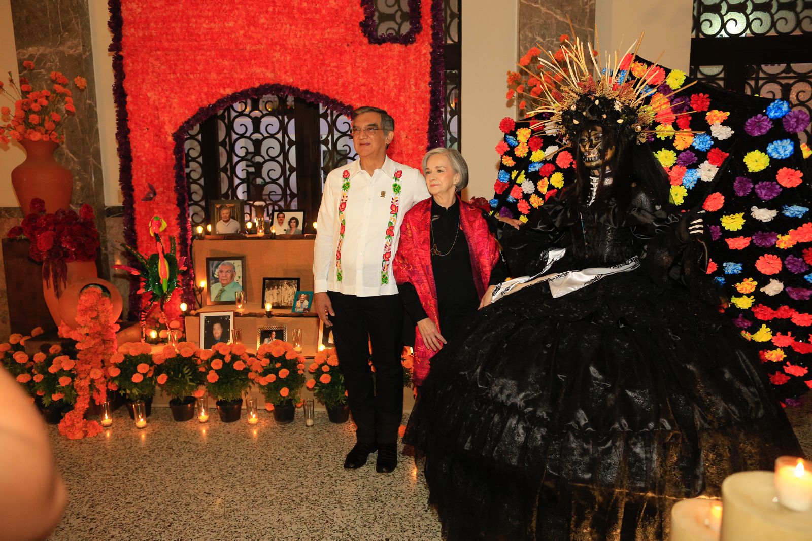 En un ambiente impregnado por el aroma de la flor de cempasúchil, el pan de muerto y las luces de las velas, el gobernador Américo Villarreal Anaya y la presidenta del Sistema DIF Estatal, María de Villarreal presidieron la premiación del concurso estatal de catrinas y catrines «Almas Tamaulipecas» y la muestra del altar monumental del Día de Muertos en las escalinatas de Palacio de Gobierno .