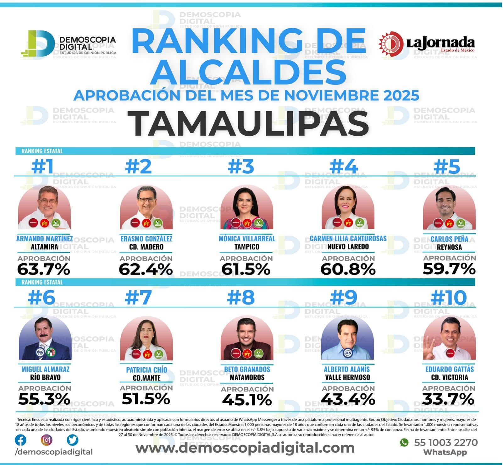 Según el Ranking de Alcaldes – Aprobación Noviembre 2025, el mandatario altamirense lidera la lista estatal con un 63.7% de aprobación, colocándose en el primer lugar. En la segunda posición aparece el alcalde de Ciudad Madero, Erasmo González Robledo, con 62.4%, mientras que en el tercer sitio se ubica la presidenta municipal de Tampico, Mónica Villarreal Anaya, con 61.5%.