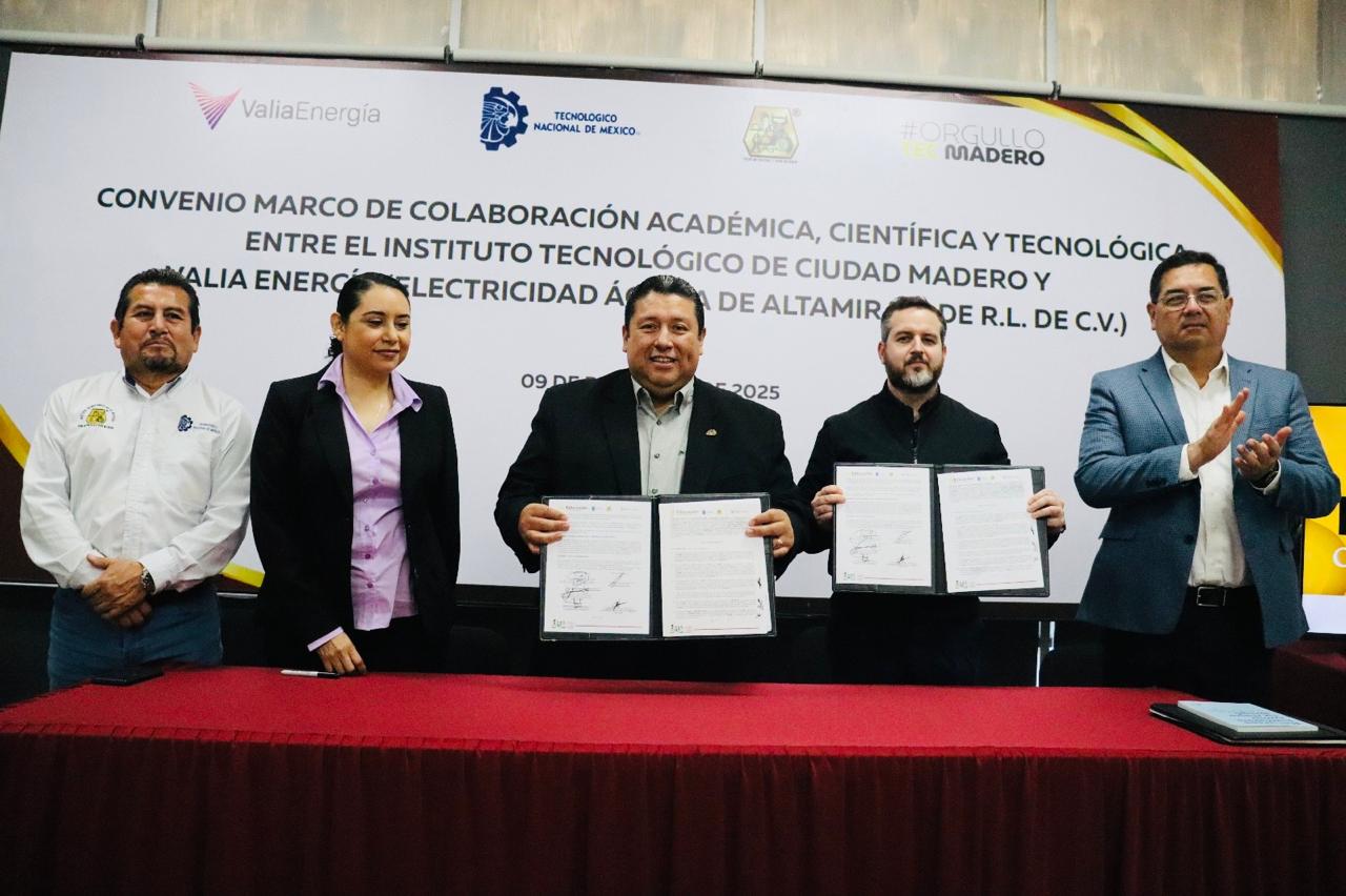 El Instituto Tecnológico de Ciudad Madero (ITCM) y la empresa Valia Energía, Electricidad Águila de Altamira, formalizaron un Convenio Marco de Colaboración Académica, Científica y Tecnológica con el propósito de fortalecer la vinculación entre el sector educativo y la industria energética.