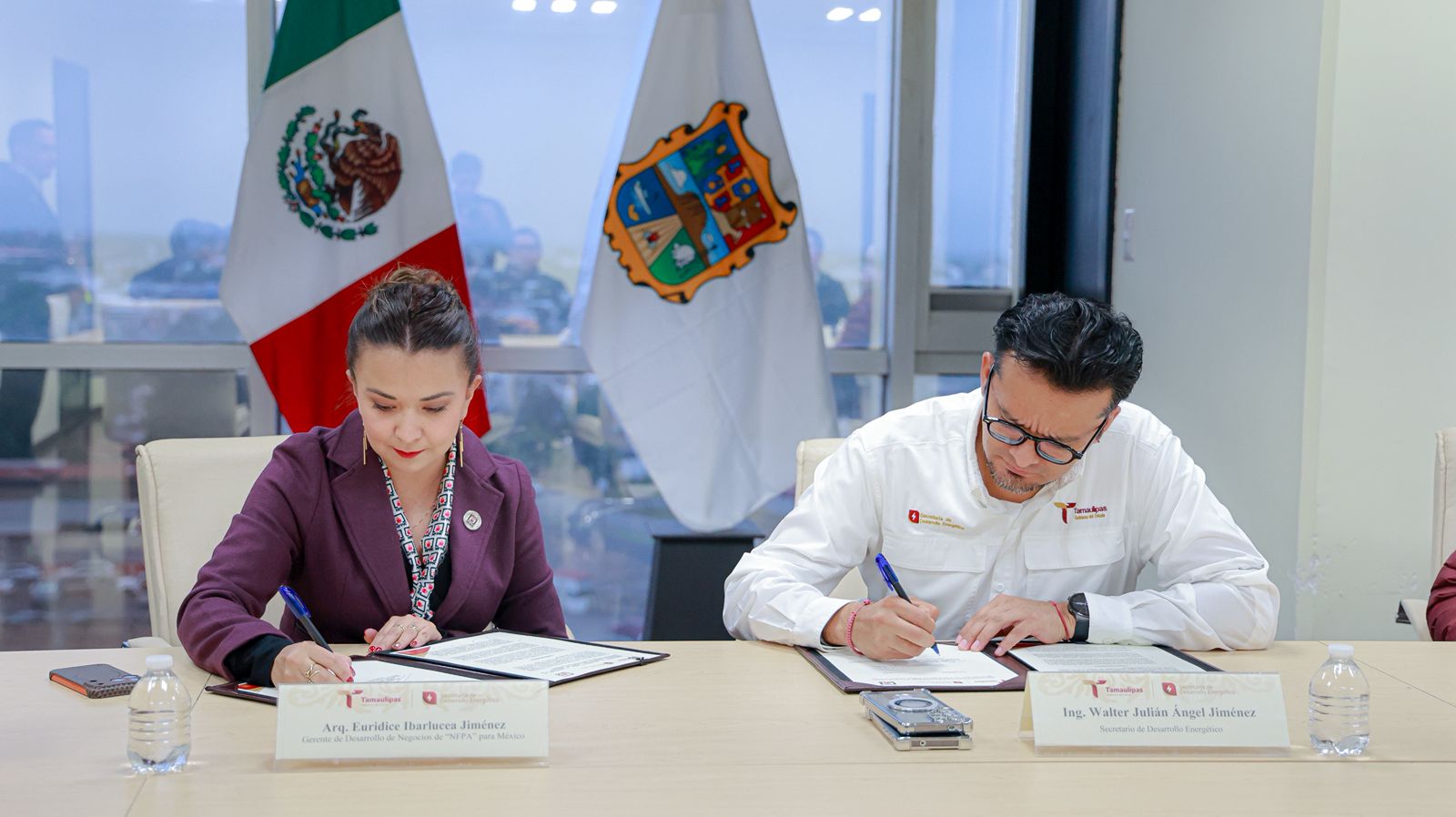 En este acto participó el secretario, Walter Julián Ángel Jiménez y Euridice Ibarlucea Jiménez, gerente de Desarrollo de Negocios de NFPA en México para firmar este instrumento siendo una alianza estratégica para el Gobierno del Estado de Tamaulipas.
