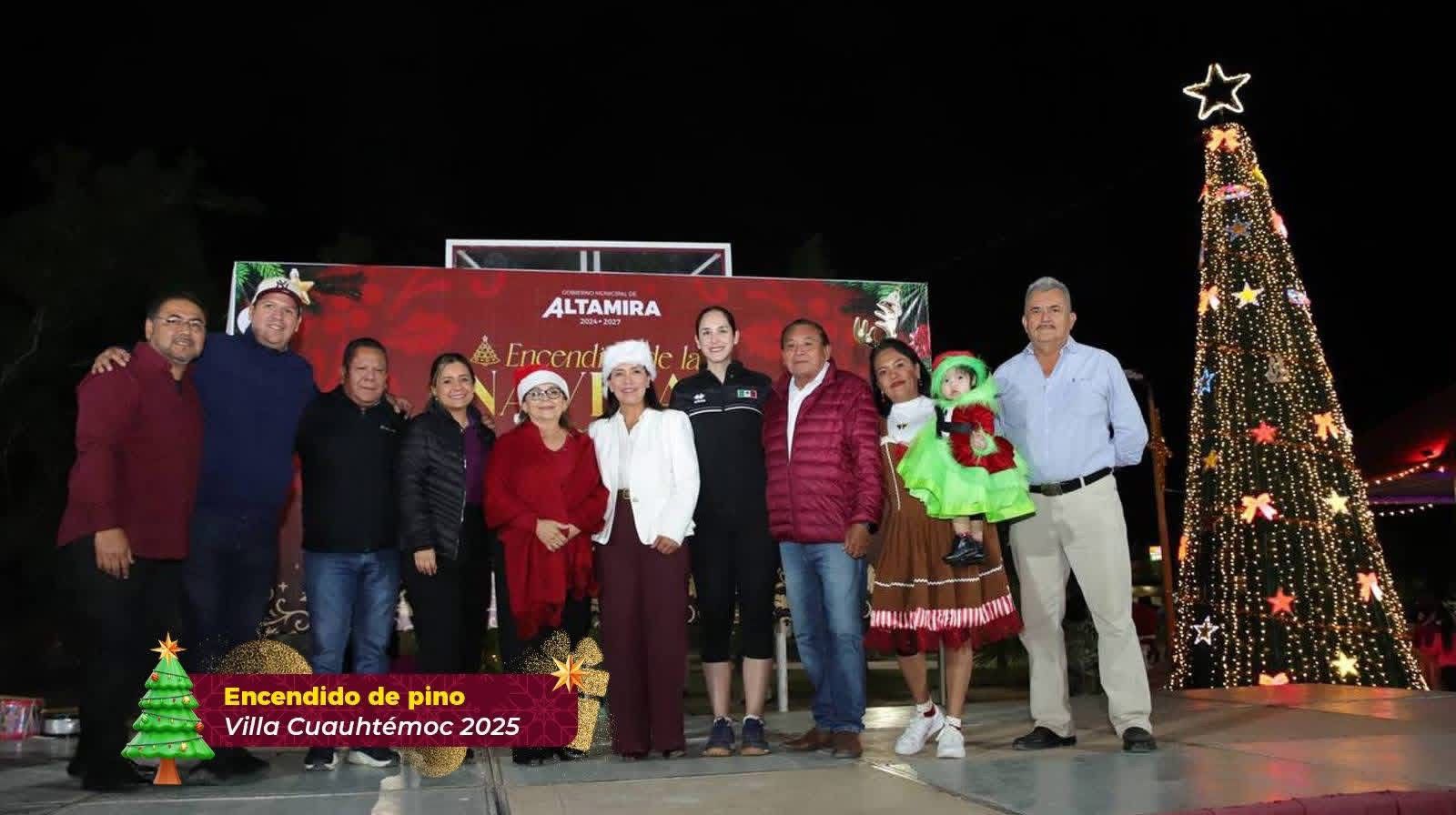 La magia de la Navidad continúa recorriendo cada rincón de Altamira, llevando alegría, unión y esperanza a las familias del municipio, con el encendido del tradicional Pino Navideño en las comunidades de Mata del Abra, Maclovio Herrera y Flores Magón.