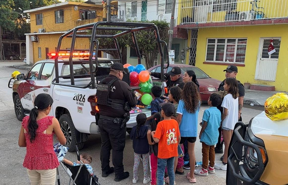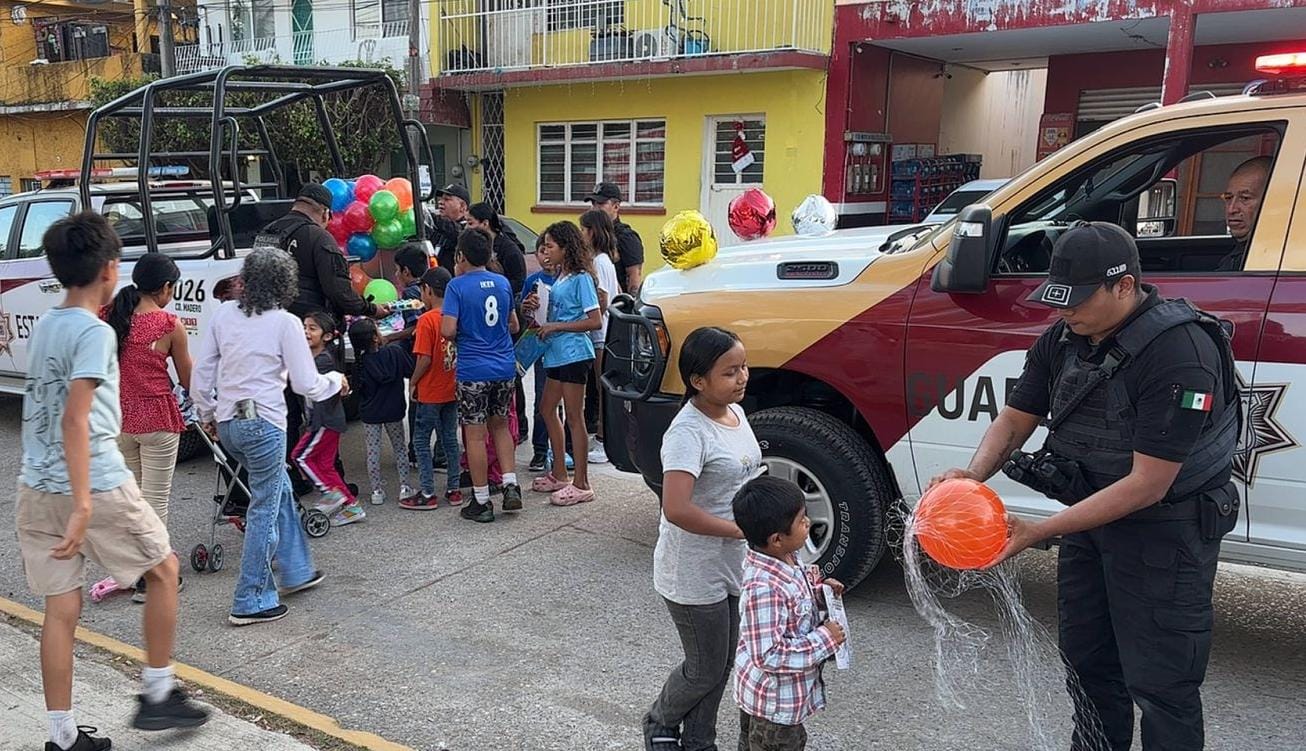 En un ambiente de convivencia comunitaria, personal de la Guardia Estatal realizó un recorrido por diversas colonias de Ciudad Madero para llevar juguetes a niñas y niños de escasos recursos, como parte de una acción solidaria con motivo de la temporada decembrina.