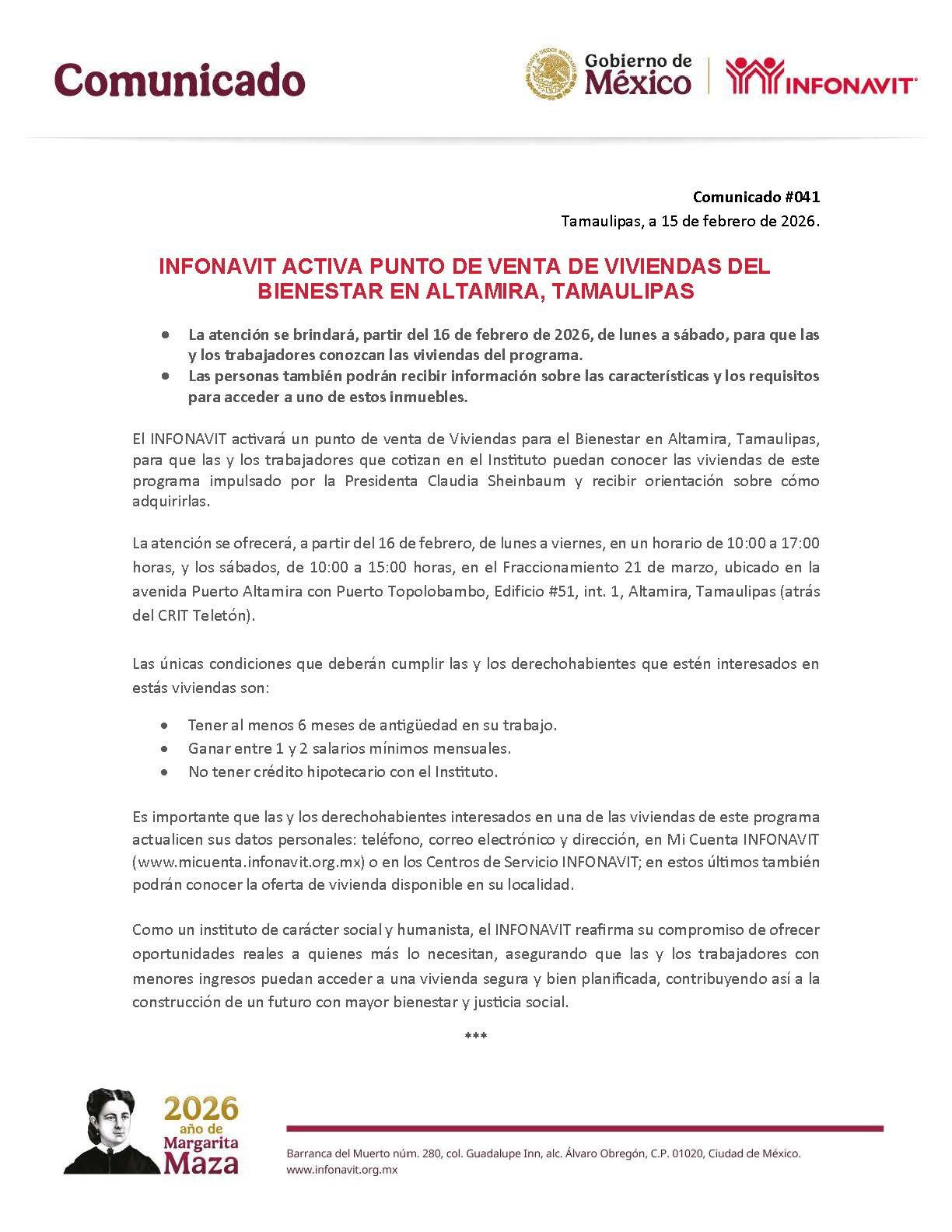– La atención se brindará, partir del 16 de febrero de 2026, de lunes a sábado, para que las y los trabajadores conozcan las viviendas del programa.