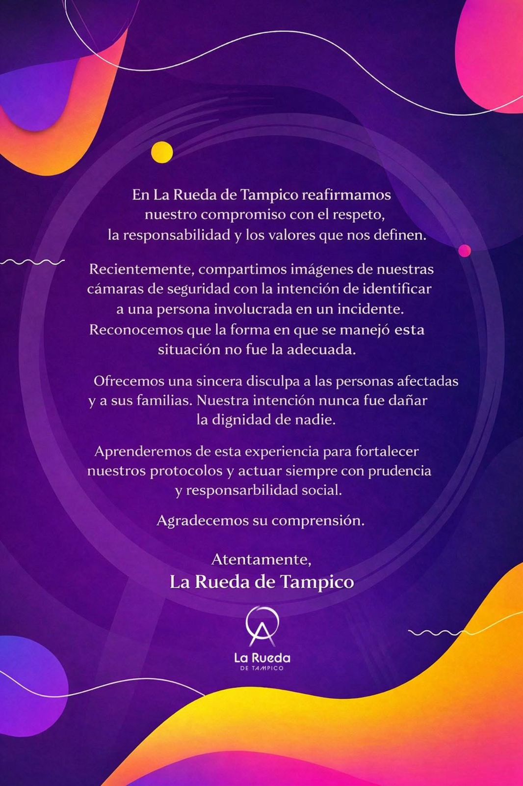 Luego de que se difundiera en redes sociales un incidente en el que una persona resultó lesionada en un juego instalado en la parte inferior de La Rueda de Tampico, la empresa emitió un posicionamiento público en el que reconoció fallas en el manejo de la situación.