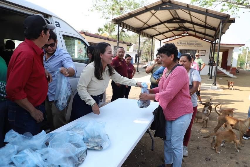En el ejido Ampliación San Antonio El Plátano, Blanca Guzmán Hinojosa realizó un recorrido comunitario en el que entregó pescado fresco directamente en los hogares, como parte de un apoyo alimenticio dirigido a familias del sector rural.