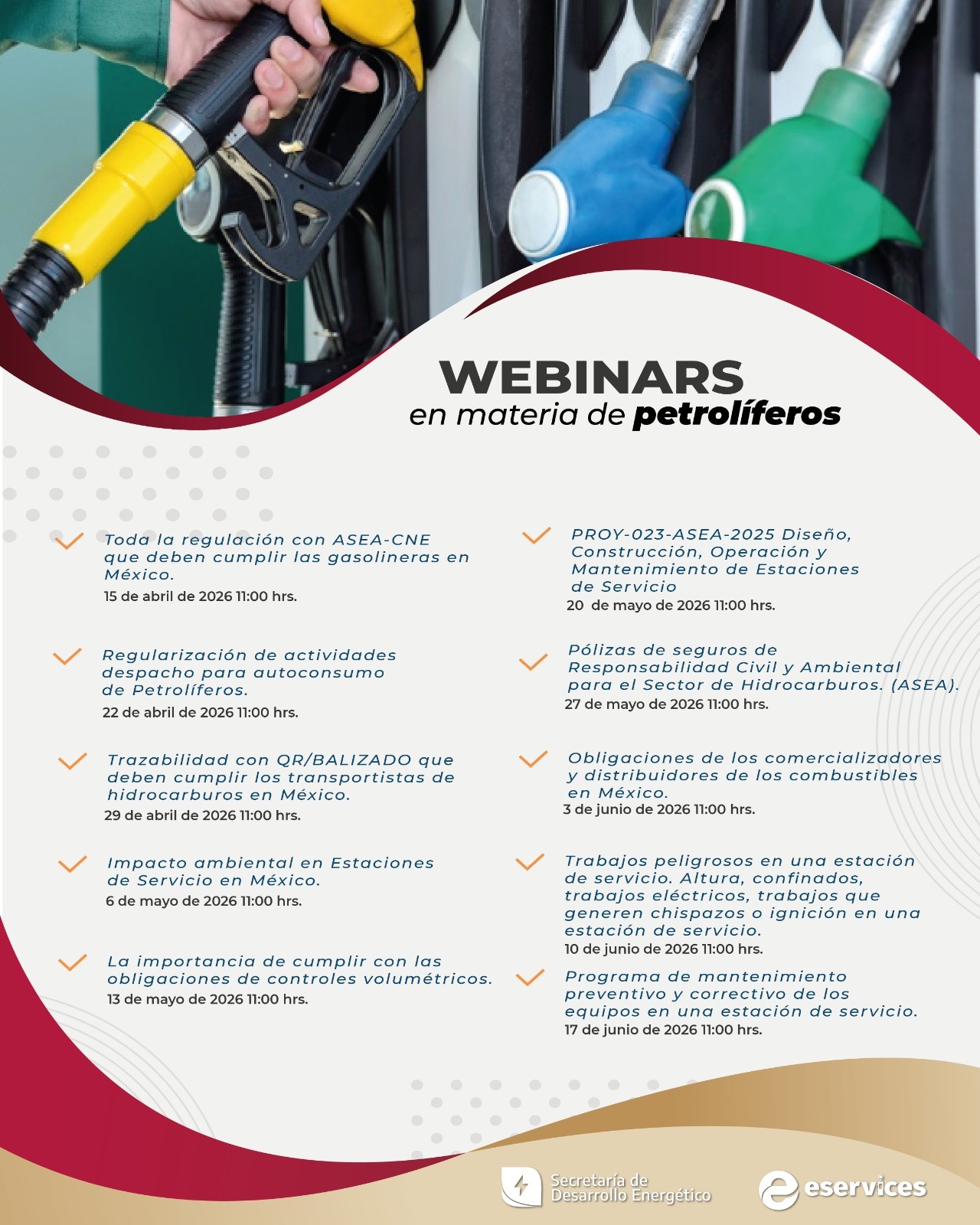Con el objetivo de fortalecer el conocimiento y el cumplimiento normativo en el sector energético, la Secretaría de Desarrollo Energético de Tamaulipas (SEDENER), en colaboración con la empresa Eservices, invita a empresarios, gasolineros, operadores de estaciones de servicio y público interesado a participar en una serie de webinars en materia de petrolíferos.