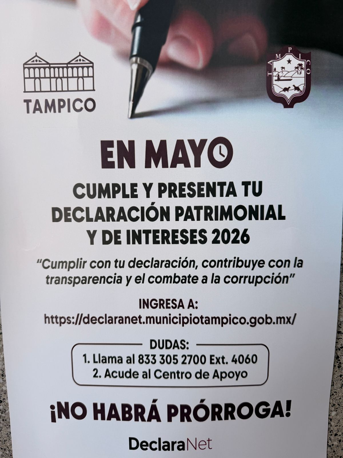 Durante el mes de mayo, todos los servidores públicos del Ayuntamiento de Tampico deberán cumplir con la presentación de su Declaración Patrimonial y de Intereses 2026, como parte de las obligaciones en materia de transparencia y rendición de cuentas.